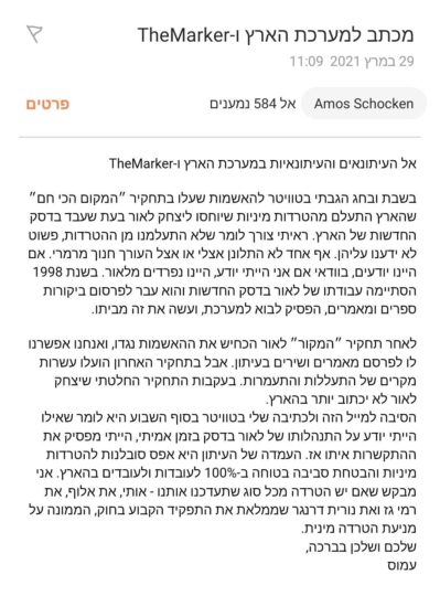 "לא, באופן כללי לא התעסקתי במה הוא עושה היום. אני כן חושבת שמתישהו כשעדויות של נשים התחילו להצטבר אצלי כמשהו שאני יודעת שעומד להתפרסם, חשבתי לעצמי שלכל הפחות יצטרכו להפסיק את ההעסקה שלו בהארץ, אבל לא העסקתי את עצמי מאוד באיך זה הולך לקרות. זה כמובן לא מופע יחידני וחד פעמי התחקיר הזה, זאת חוליה בתוך שרשרת של עשייה שכמובן קדמה לו. כחלק מהתגובה לתחקיר נהייתה קבוצת לחץ למשל בטוויטר, ששם נמצאים עיתונאים ופוליטיקאים, ואני חושבת שזה היה חלק הכרחי".