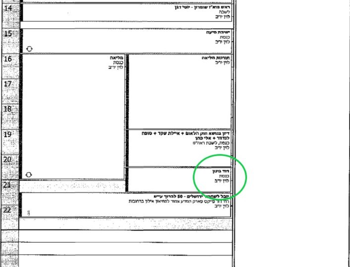 הקטע המדהים הוא שהפגישה מופיעה ביומן של יריב לוין, שר התיירות דאז. אבל לא בדרך שבה הייתם מצפים לראות אותה. ביומן של לוין הוסתרה המהות שלה וכל מה שמצויין בה הוא "פגישה עם ביטן". ביטן מכר את הפגישה הזו תמורת בצע כסף. שר התיירות יריב לוין הסתיר את מהותה מהיומן. היום הפגישה הזו קשורה בפרשיית שחיתות חמורה. פנינו ללוין ושאלנו למה הפגישה הזו לא צוינה ביומן באופן הראוי. מלוין לא נמסרה תגובה.