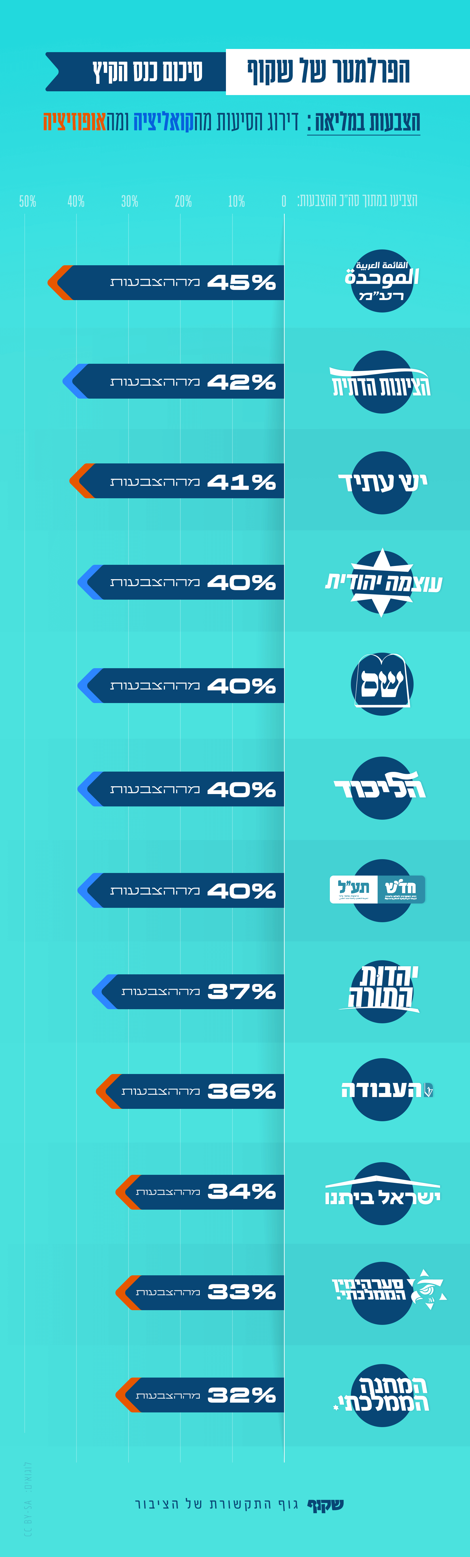בדירוג הסיעות מופיעה ראשונה סיעת רע"ם, שחבריה הגיעו לכ-45% מההצבעות. אחריה הציונות הדתית (42%), יש עתיד (41%), עוצמה יהודית וש"ס (40%), הליכוד (40%), חד"ש-תע"ל (40%), יהדות התורה (37%), העבודה (36%), ישראל ביתנו (33%), סיעת תקווה חדשה – הימין הממלכתי (33%) ואחרונה המחנה הממלכתי (33%).