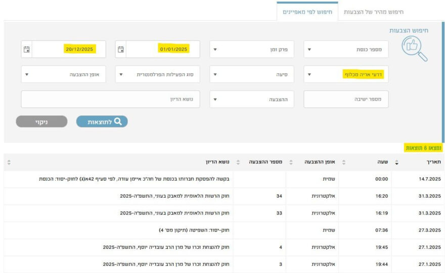 6 הצבעות ב-2025. צילומסך מאתר הכנסת